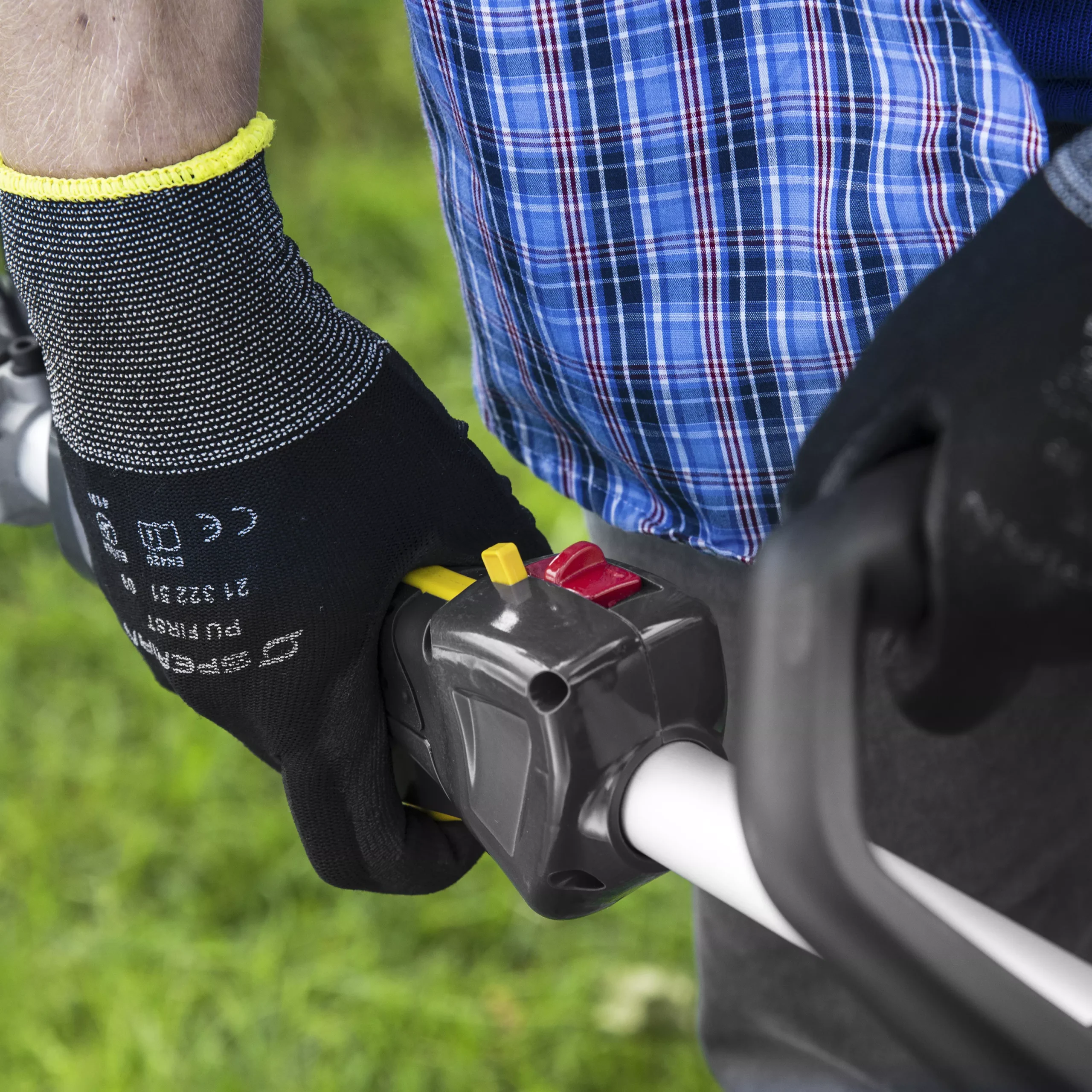 - Curved shaft for easy trimming around lawns and flowerbeds